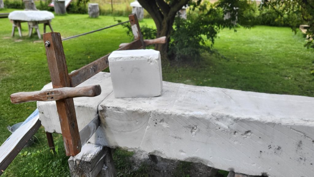 Nach dem netten Austausch, einer kleinen Stärkung, ein paar wärmenden Sonnenstrahlen (ja, wirklich – kurz kam sie raus!), geht’s zurück zum Auto nach Laas. Nicht ohne noch schnell an der Freilichtausstellung vorbeizuschauen. Hier wird der Marmor greifbar – und zwar wortwörtlich: Ich säge. Ich schleife und haue ein Herz in den Marmor.